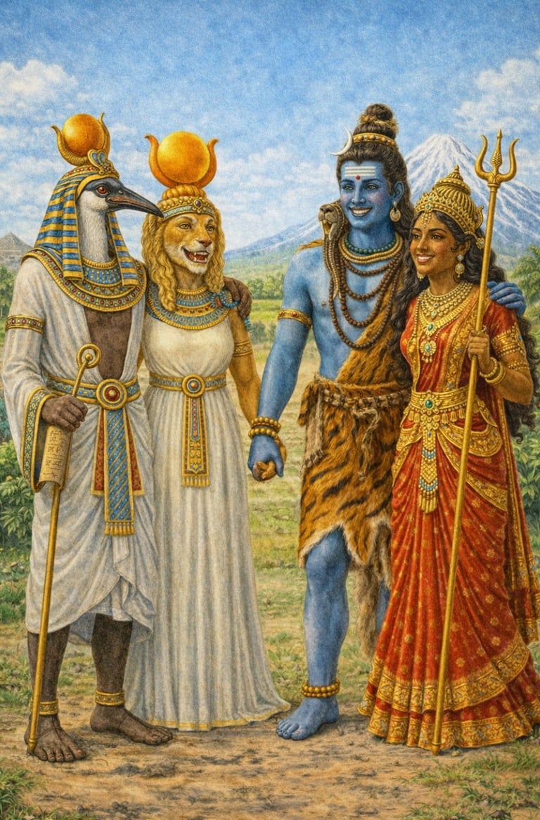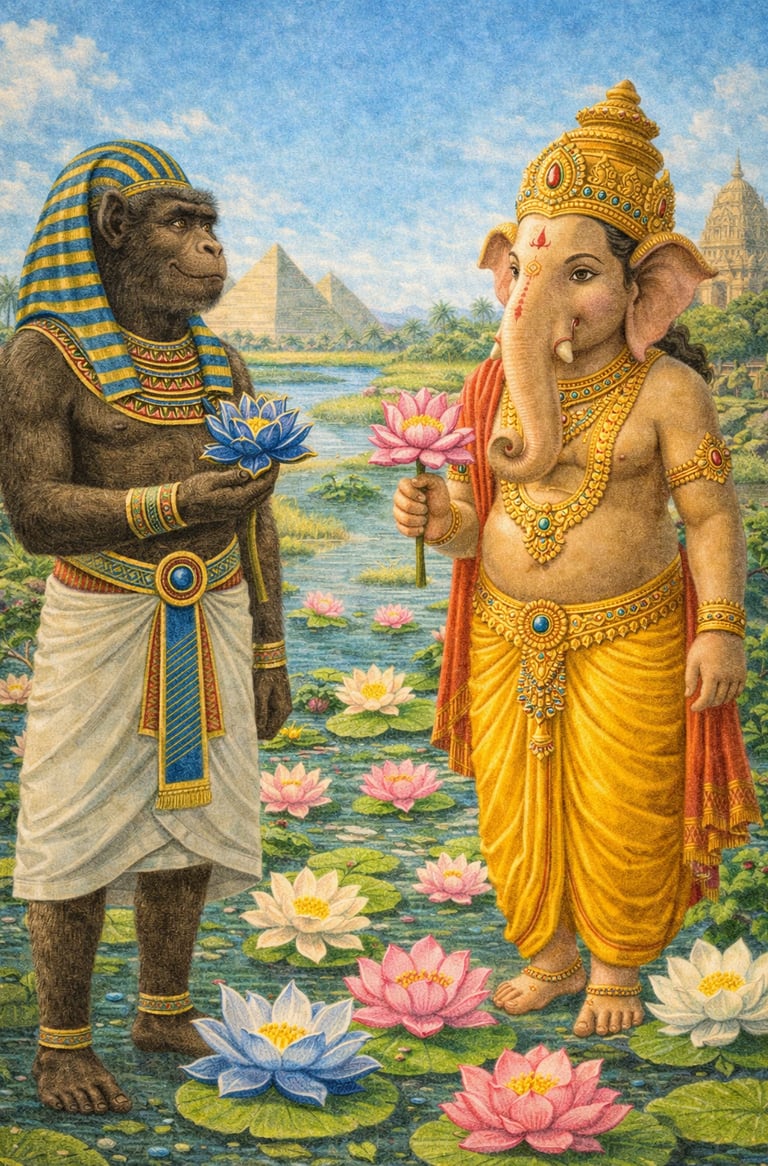 The two civilizations identify blue as the color of the source. For the Egyptians, it is the fysical source—the water and fertile land from which their world literally springs. For Hindus, it is the metafysical source—the infinite spiritual reality from which the universe emanates.